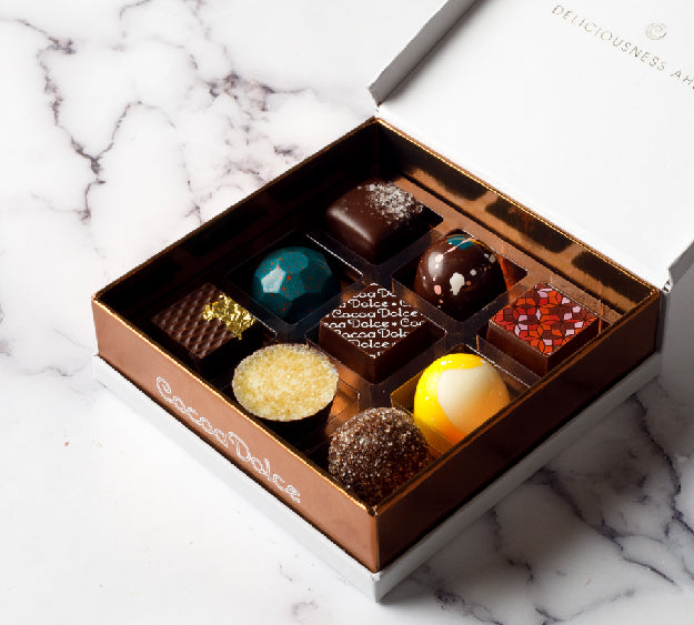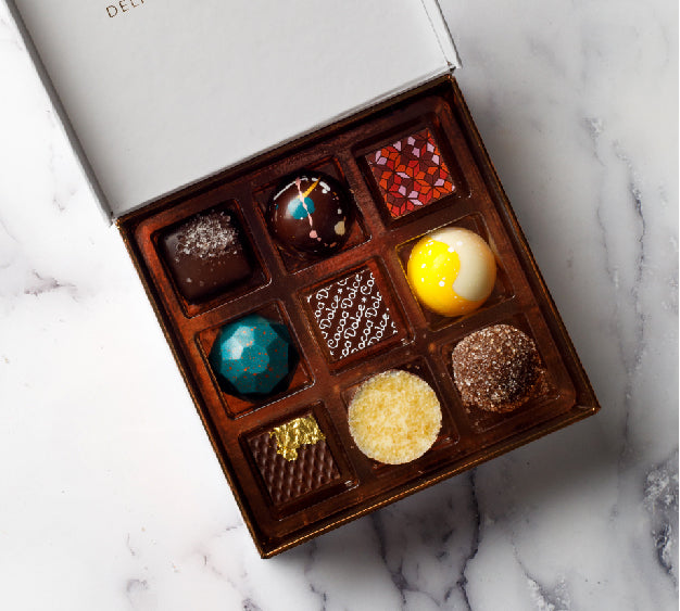 Our best-selling collection of our 9 most popular chocolates, each artfully crafted with premium Callebaut Belgian chocolate. This collection is the perfect Quick Fix for any chocolate craving. Includes our Cocoa Dolce signature Salted Caramel chocolate surrounded by a balanced variety to give a delicious overview of Cocoa Dolce flavors - Champagne, Raspberry, Dulce de Leche, and more!